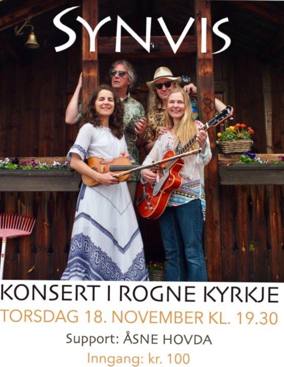 Synvis konsert 2021 - Torsdag 18. november kl. 19.30. Support Åsne Hovda. Inngang kr. 100,- VELKOMEN! Arrangør Rogne sokneråd