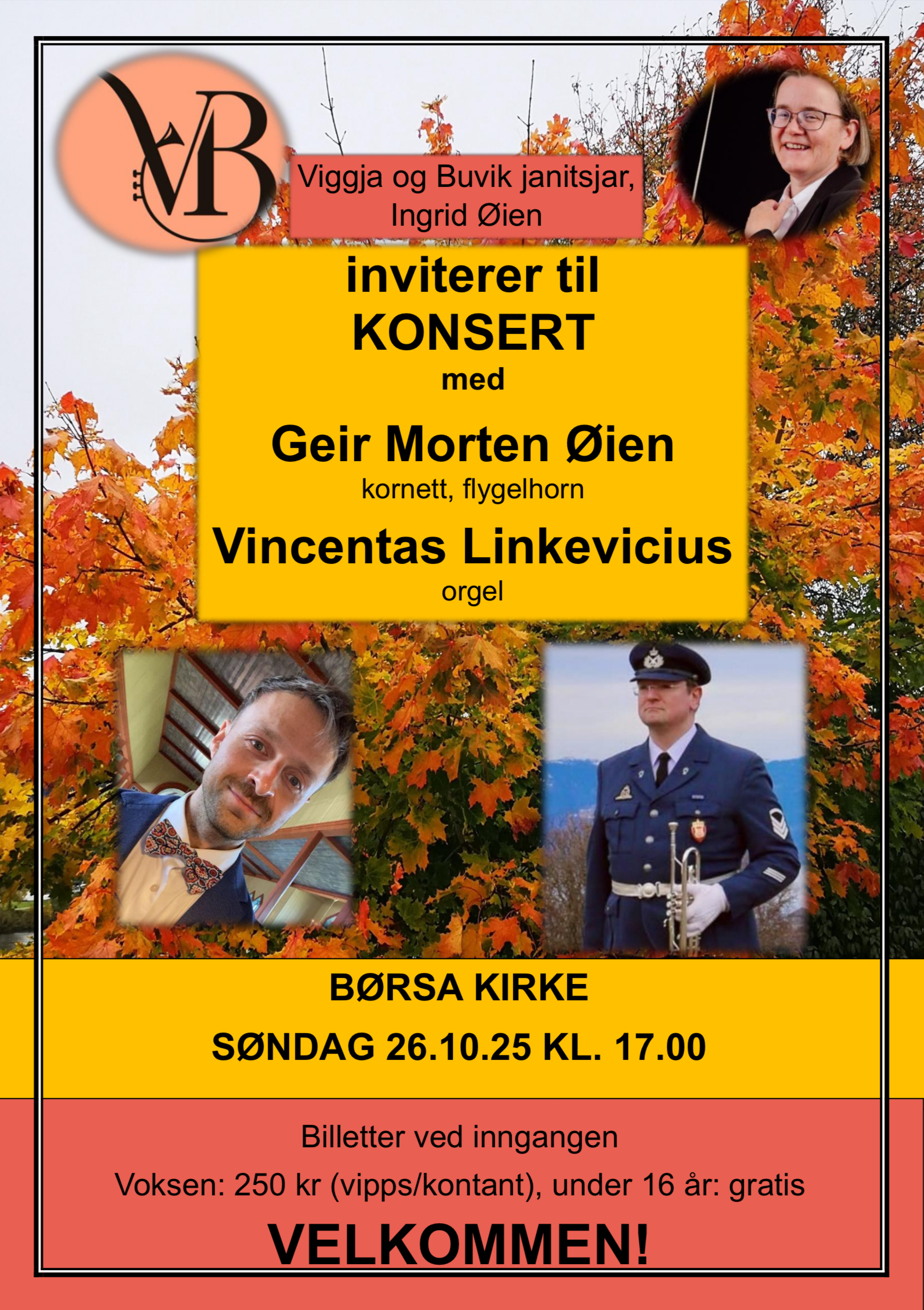 Geir Morten Øien på div småmessing, og Vincentas Linkevicius på orgel. Ingrid Øien dirigerer et heltent korps gjennom et variert og fint konsertprogram.