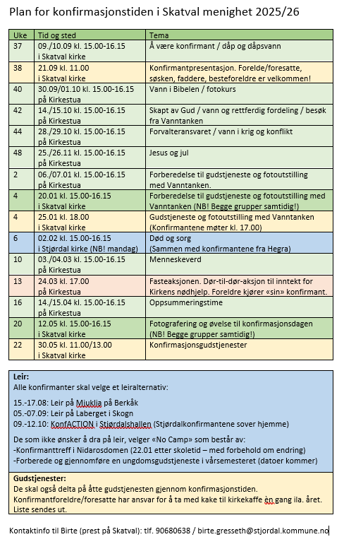 Timeplan for konfirmantundervisning i Skatval 2025-2026