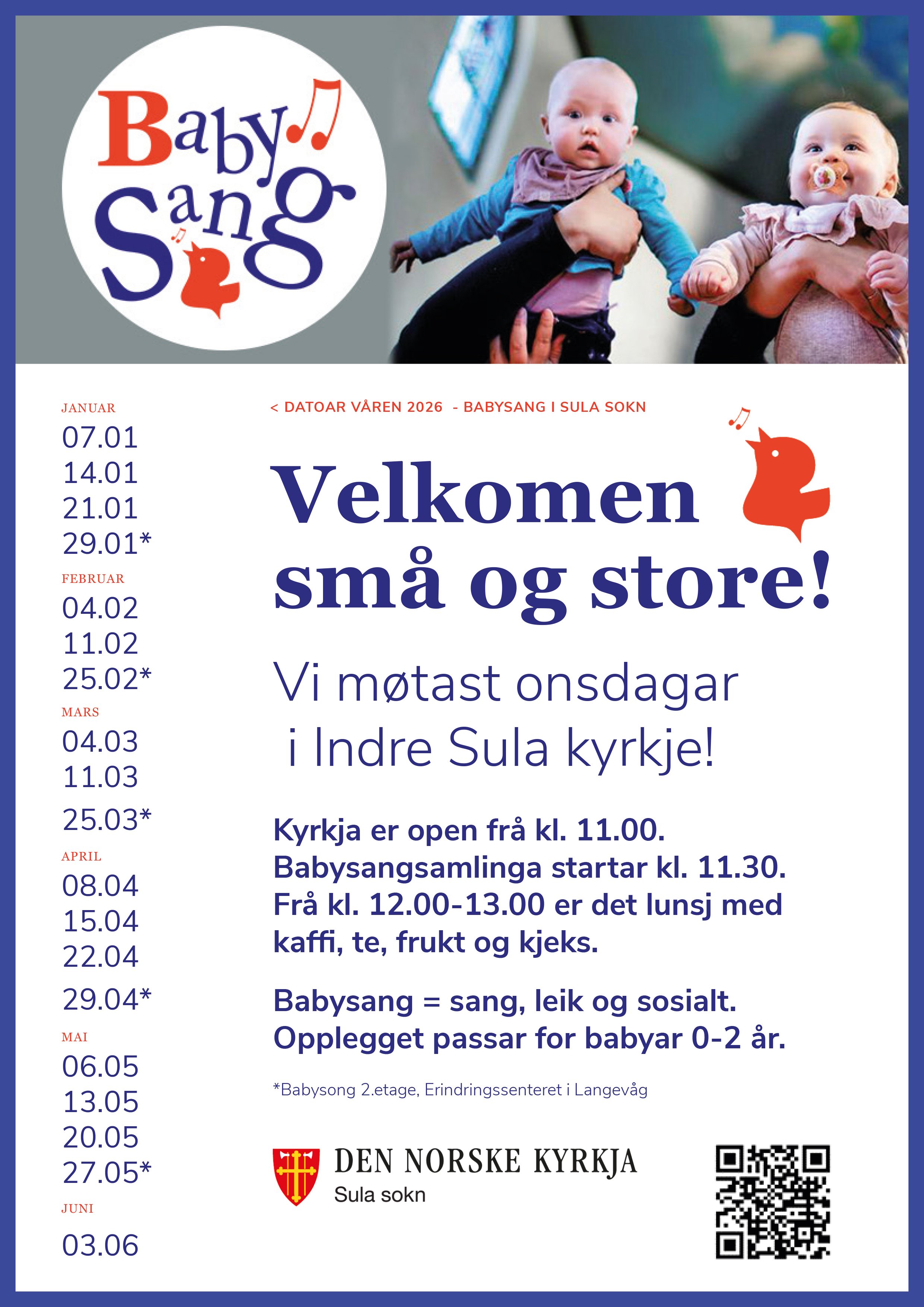 Onsdag 11.02 kl. 11:00 - 13.00 i Indre Sula kyrkje. Babysongsamling startar kl. 11.30