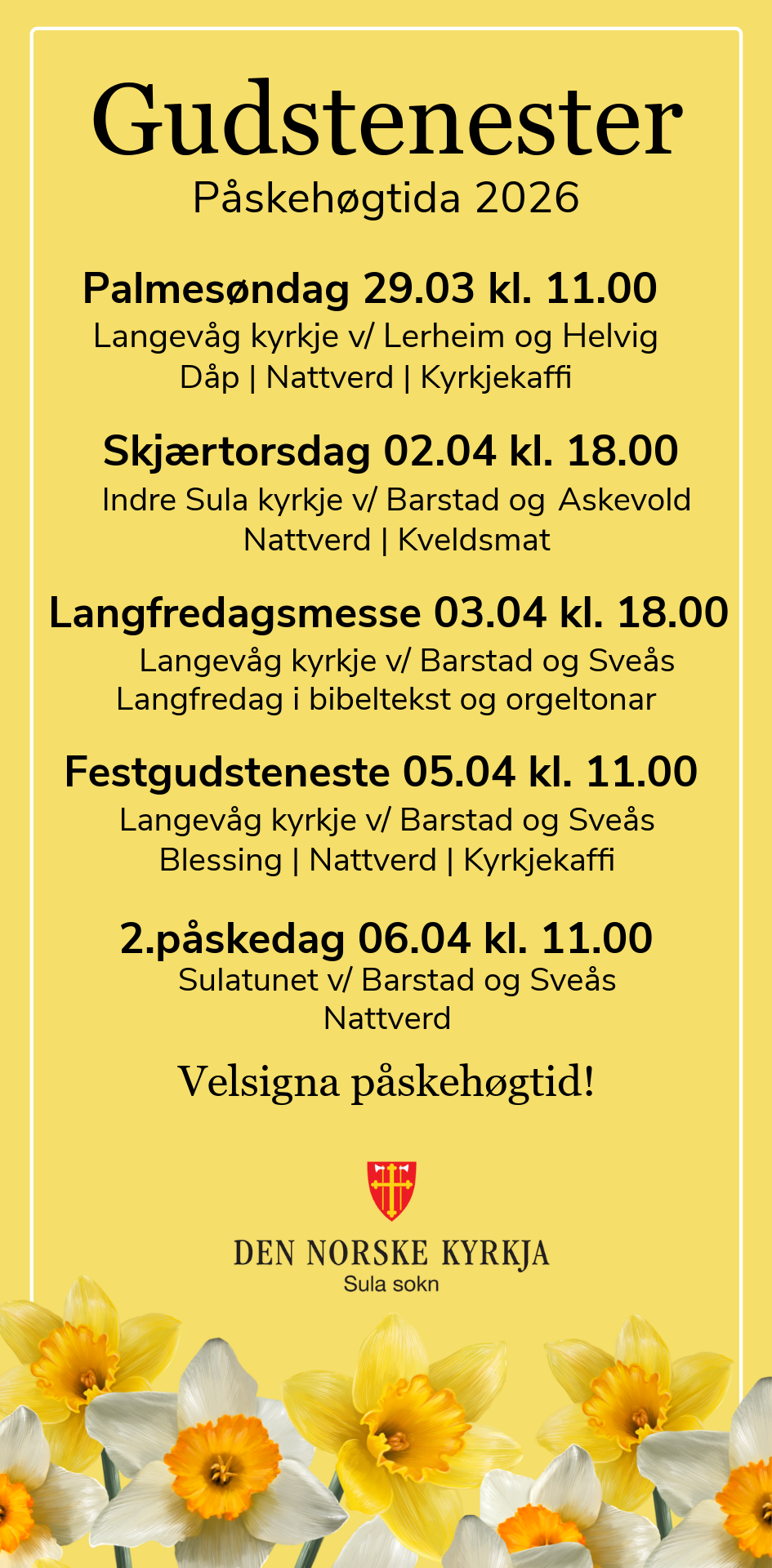 Vi samlast for å feire påskehøgtida i kyrkjene på Sula. I Bibelen les vi at Jesus sigra over døden. I naturen kan vi sjå livet som gror fram. Difor kan vi med rette seie at vi feirar livet, når vi feirar påske. Varmt velkomen til gudstenester i påska. Velsigna påskehøgtid!