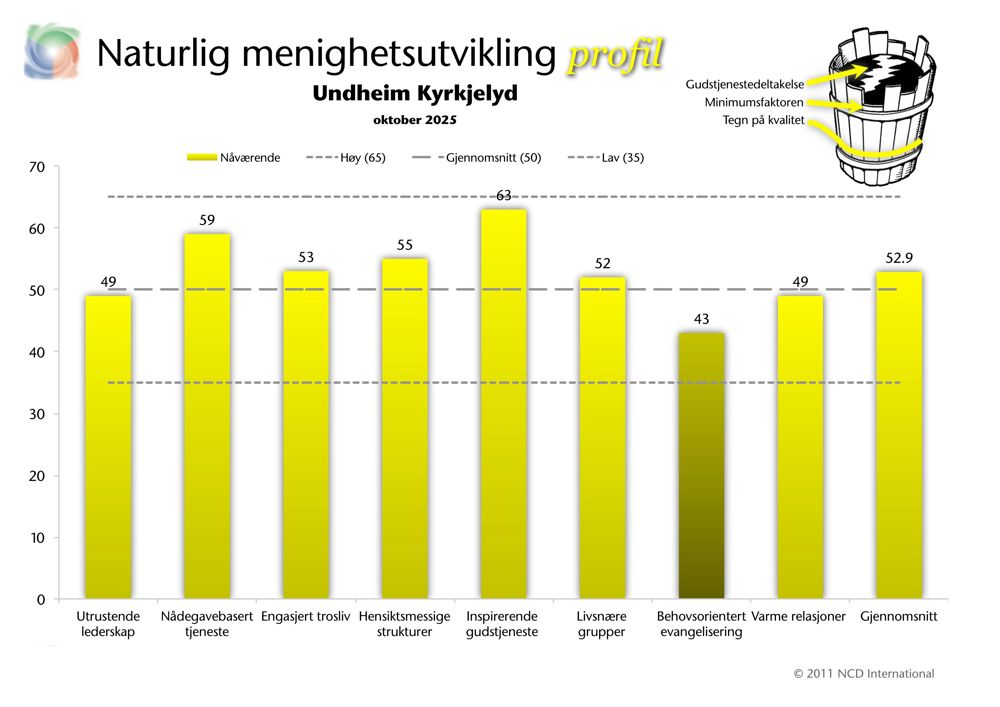 Kva så med Undheim? På biletet under teksten kan me sjå at Undheim kyrkjelyd er gode på Inspirerende Gudstjenester og Nådegavebasert Tjeneste spesielt, mens me har størst potensiale for vekst på på området Behovsorientret Evangelisering.