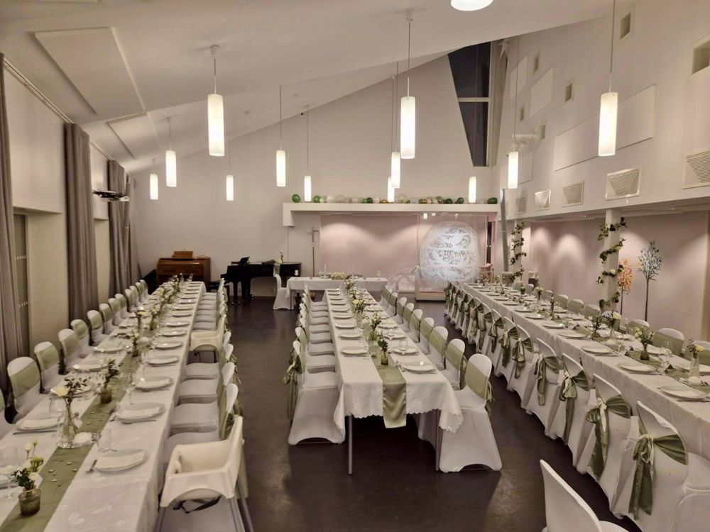 Menigheten leier ut "Menighetssalen" med plass til opptil 80 personer. Det er også mulig å leie "Kirketorget" med plass til ca. 20 personer. Prisene varierer etter ukedag og hvilke rom som ønskes leid. Klikk på den boksen nedenfor "Informasjon om utleie" for å se utleievilkår og priser.