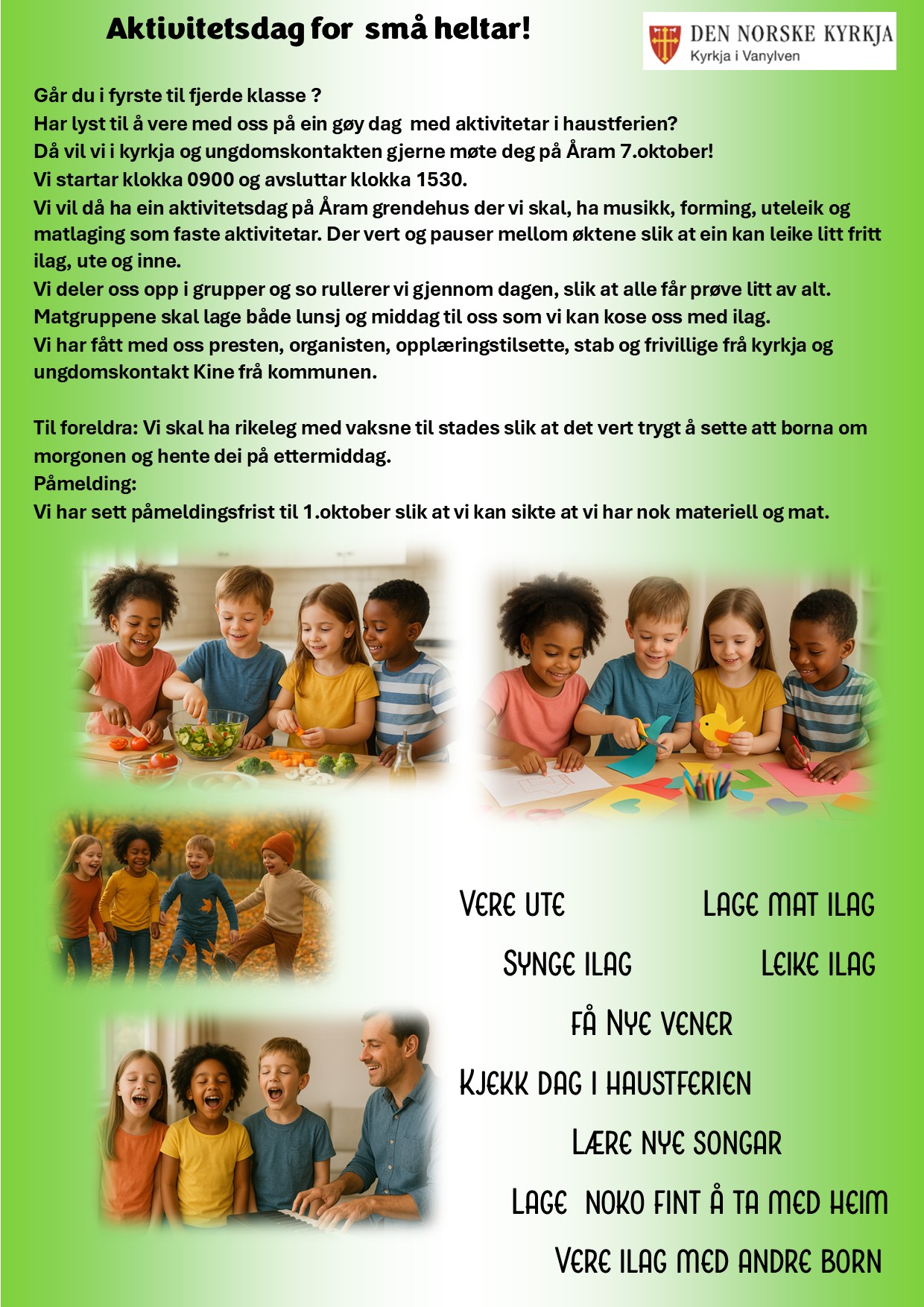 23.9.2025Tysdag 7.oktober vil vi ha ein aktivitetsdag for 1.-4. klasse på Åram