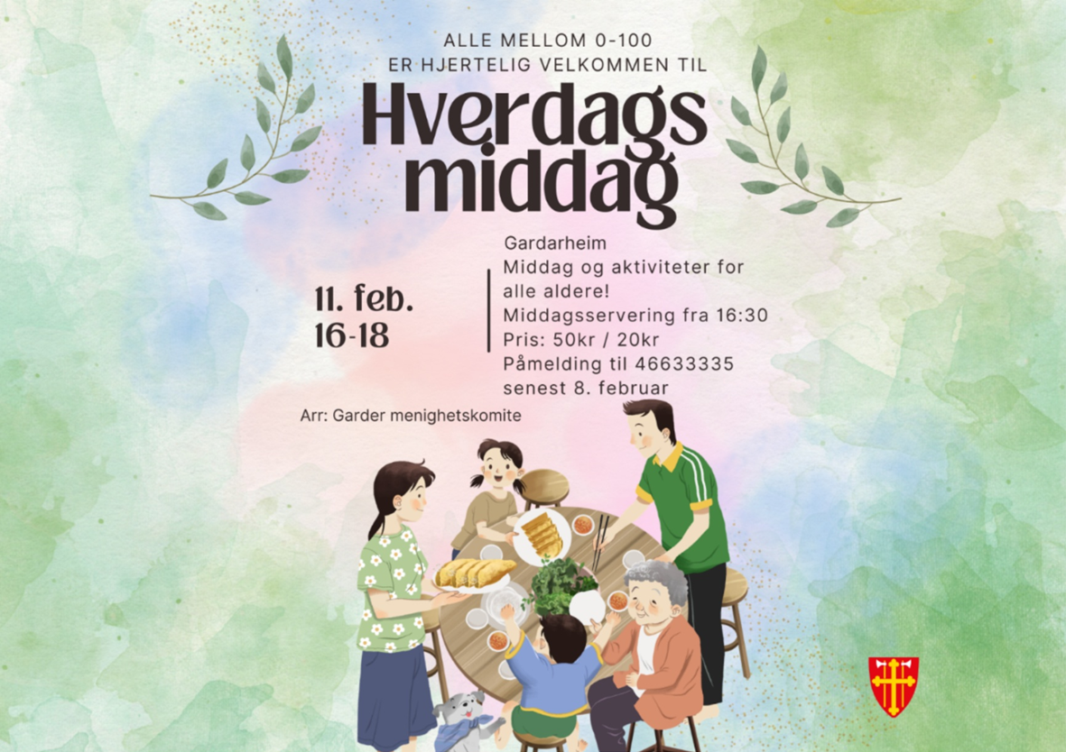 Alle mellom 0-100 år er hjertelig velkommen til en koselig hverdagsmiddag på Gardarheim, onsdag 11. februar kl.16-18
